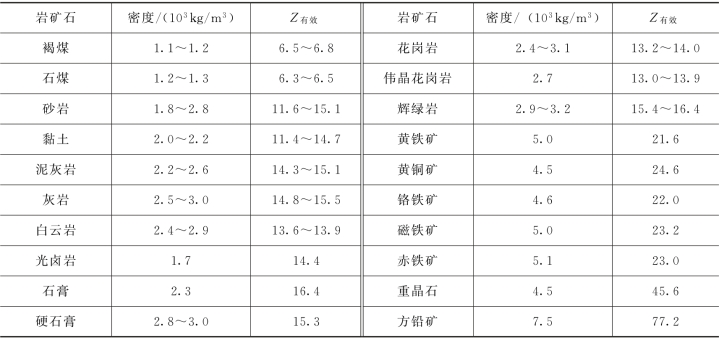 表10-4 部分常见岩石、矿石的有效原子序和密度