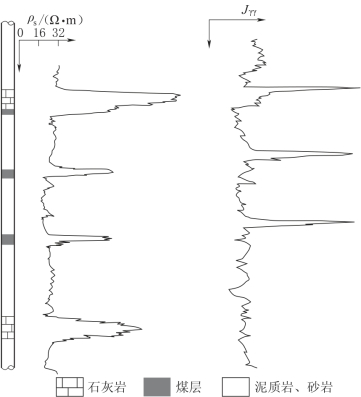 图10-57为利用γ-γ测井划分密度不同岩层又一实例。整个井孔有泥质岩、粉砂岩、灰岩和煤层。在这井孔中进行了视电阻率测井和γ-γ测井。由于煤和灰岩均为高电阻率介质,在视电阻率测井曲线上均出现高电阻率异常,无法由高电阻率异常确定煤层位置。而由于煤层密度较泥质岩、粉砂岩、砂岩密度低很多。所以在γ-γ测井曲线上,煤层与其他岩层间有明显的不同反映。其他几种岩层间密度的差别,不如煤层与它们之间的差别那样大,引起γ-γ测井曲线变化亦不够明显。从而由γ-γ测井三个异常准确地确定了煤层位置。