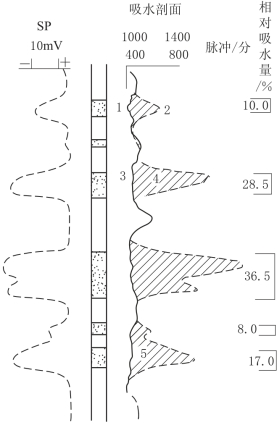此外,吸水剖面的测量对于了解含水层的渗透性、压水试验中各个地层的吸水性能都是非常重要的。测量时,先测一条自然γ背景曲线,如图10-65所示之实线,然后再将活化悬浮液注入井内后测一条活化γ曲线(图10-65中之虚线)。由于吸水层在吸入水的同时,固相载体滤积在相应层段的井壁表面,形成一层活化层。地层吸水量越大,同位素载体在井壁上的滤积量越多,于是两条γ曲线幅度相差就越大。如将两条γ曲线叠绘在一起并以非吸水层(如泥岩)段作为幅度差为零的标准,则在吸水层段上两条曲线所包围的面积Si(图10-65中之4)与该层的相对吸水量qi成正比,即