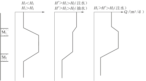 典型的理论流量曲线如图10-68所示,该井有两个含水层M1、M2,相应的静止水头为H1、H2。当抽水或注水时井内的混合水位为H'。根据H1、H2、H'三者间的相互关系,井内将出现不同的流动状态和补给关系: