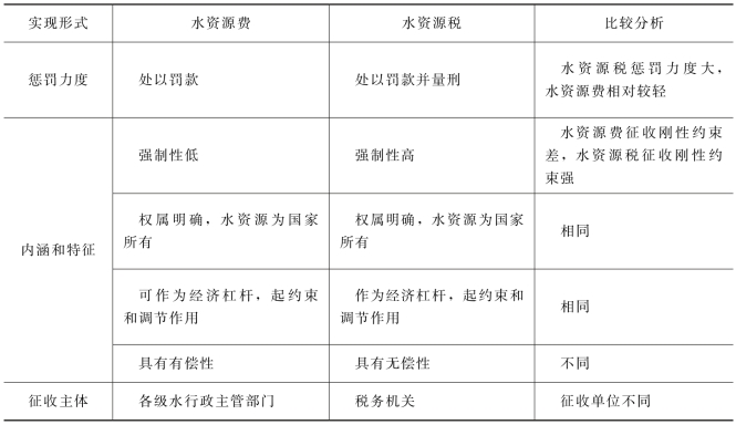总体上,水资源费与水资源税都是水资源有偿使用的实现形式,费与税两者最大的区别主要体现在强制性上,水资源税比水资源费的强制性更高,水资源税刚性约束更强,对于非法取水等行为的惩罚力度更大。