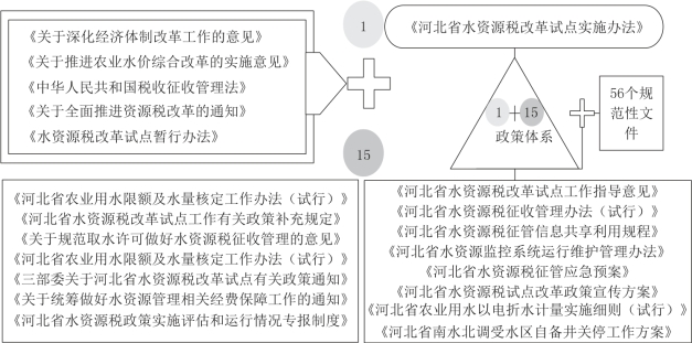 我国在水资源税改革正式实施之前就已做了大量的前瞻性工作,包括深化经济体制改革、推进农业水价综合改革以及全面推进资源税改革,这为开展水资源税改革工作奠定了基础,是水资源改革政策支撑的前一部分;而在正式开征水资源税后,河北省按照国家要求,制定了大量的政策文件,逐步形成了以“1+15”政策体系和56个规范性文件为主的政策制度体系,这是水资源税改革政策支撑的后一部分,两部分缺一不可。水资源税改革政策支撑体系框架如图4.1所示。