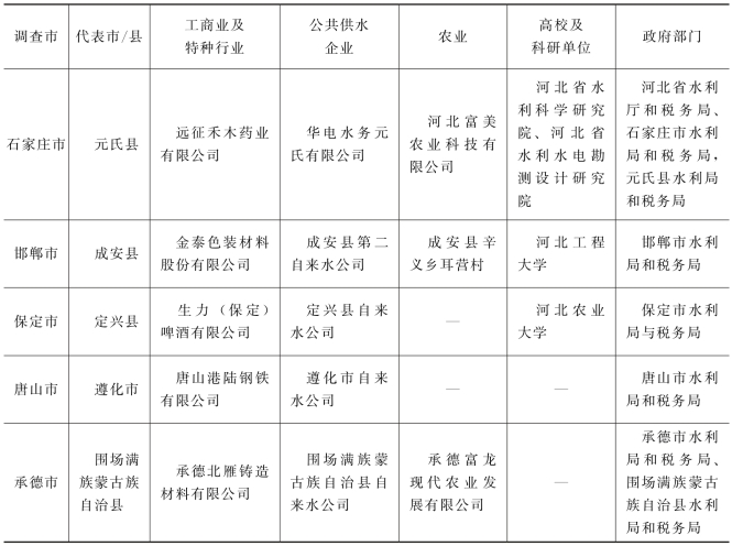 在认真分析调查目的的基础上,将调研主要分为两次,第一次调研时间为2019年7月22—24日,第二次调研时间为2019年8月12—15日,主要调查对象信息见表5.1。从表中可以看出调研主要涉及石家庄、邯郸、保定、唐山和承德5个市及其下辖的几个县,按照摸底调查和典型试点调查的原则,保证调查的地区基本均匀分布在整个河北省,并且考虑了典型调查对象的地区代表性。根据研究目标将调查对象分为工商业及特种行业、公共供水企业、农业、高校及科研单位、政府部门共5个类型,设计相应的调查问卷,以作为定性评价的依据。同时,也对河北省水资源税改革过程中存在的重点及难点问题进行咨询,在收集整理的基础上,总结主要问题并找到相应的解决方案。