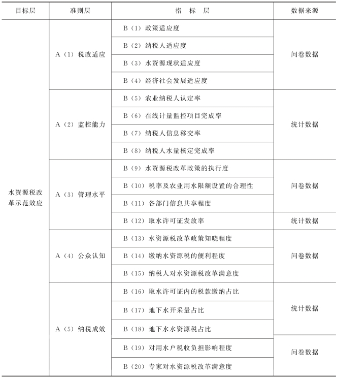 本书在评价指标体系建立原则的基础上,结合河北省水资源税改革整体效果,选取了税改适应、监控能力、管理水平、公众认知、纳税成效5个方面为准则层,每个准则层内选择若干个指标,最终选取了20个指标,构成了评价指标体系,指标体系分为目标层、准则层和指标层。