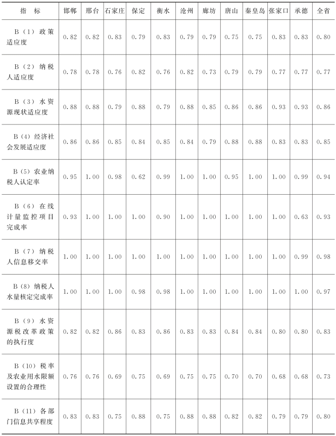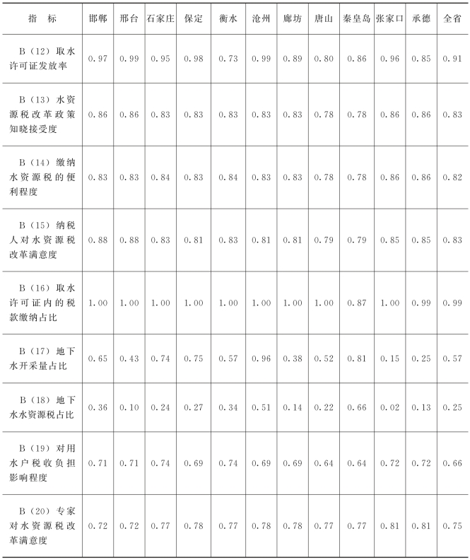 根据选定的20个评价指标体系进行评价,每个评价指标的数据均来自《河北省水资源公报》《河北省统计年鉴》和根据实地调研的问卷统计数据等,数据基本符合实际。