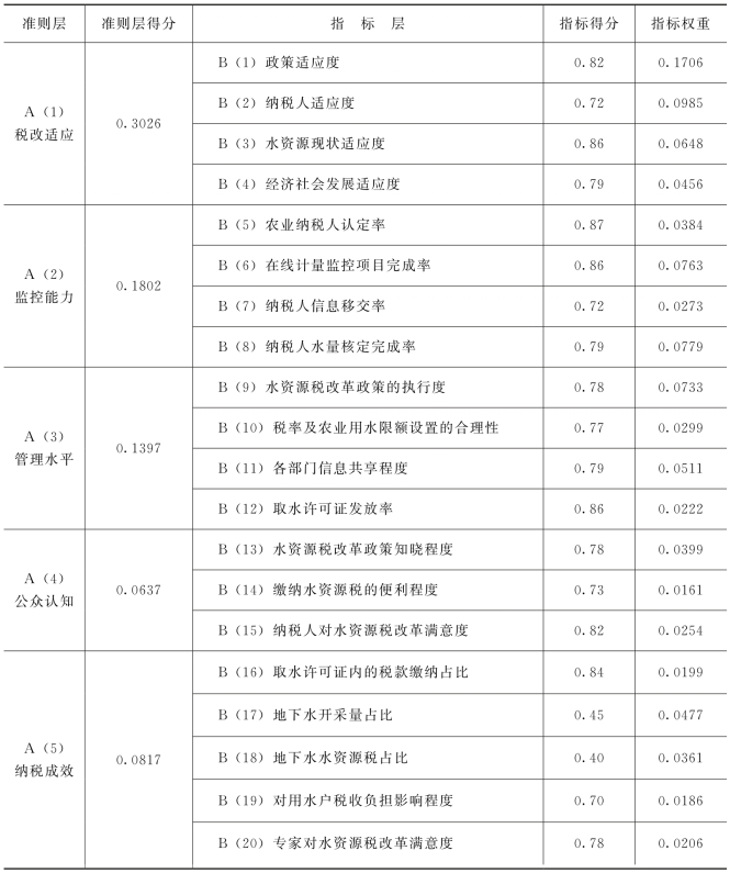 根据河南省目前水资源税改革的实际情况及未来发展趋势,对20个评价指标特征值进行赋值,并确定了每个评价指标的权重,由此计算出每个准则层的得分,见表8.9。