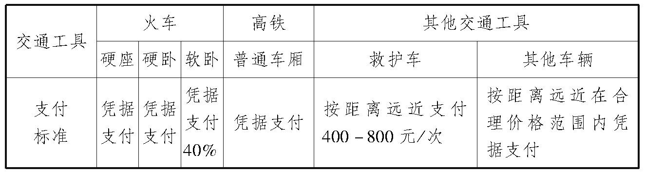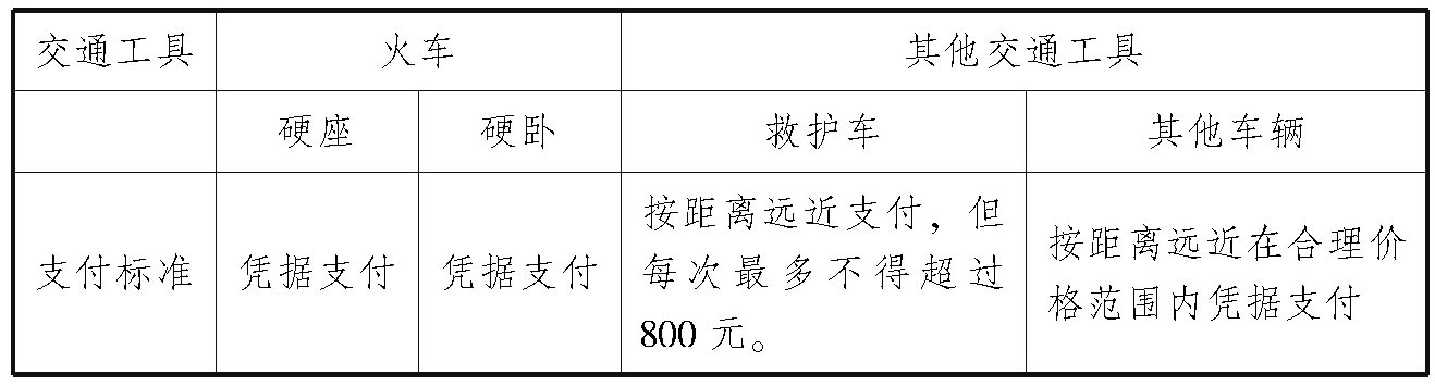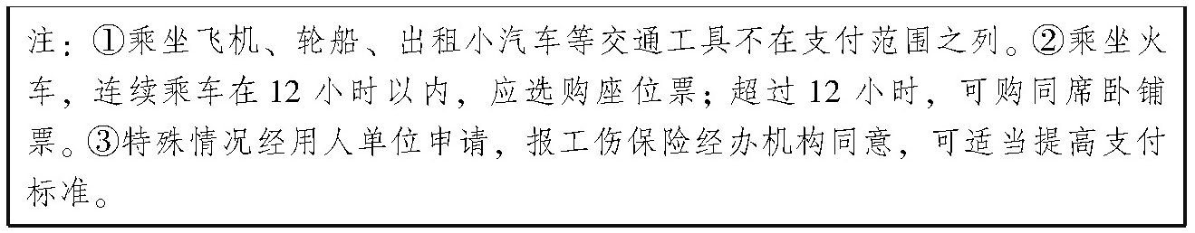 三、经市级工伤保险经办机构批准到统筹地区以外就医所需的交通费(仅限于公共交通工具及紧急抢救时救护车费,飞机、轮船、出租车等交通工具不在支付范围之内)按距离远近在合理价格范围内凭票据实报销,住宿费用(仅限于往、返时各一天的费用)暂按每人每天120元执行,伙食补助费暂按每人每天25元执行。到统筹地区以外就医所需的交通、住宿费用,仅限于往、返时各一天的费用。乘坐火车,应优先选购座位票,特殊情况可选购卧铺票(只限硬卧);出发时间超过中午12:00时的,如乘坐交通工具为火车卧铺的,不支付当日住宿费。