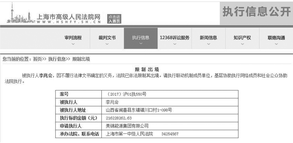 据案件执行信息显示,李兆会被限制出境,与一笔逾2.16亿元的执行款有关,案件申请执行人为美锦能源集团有限公司。