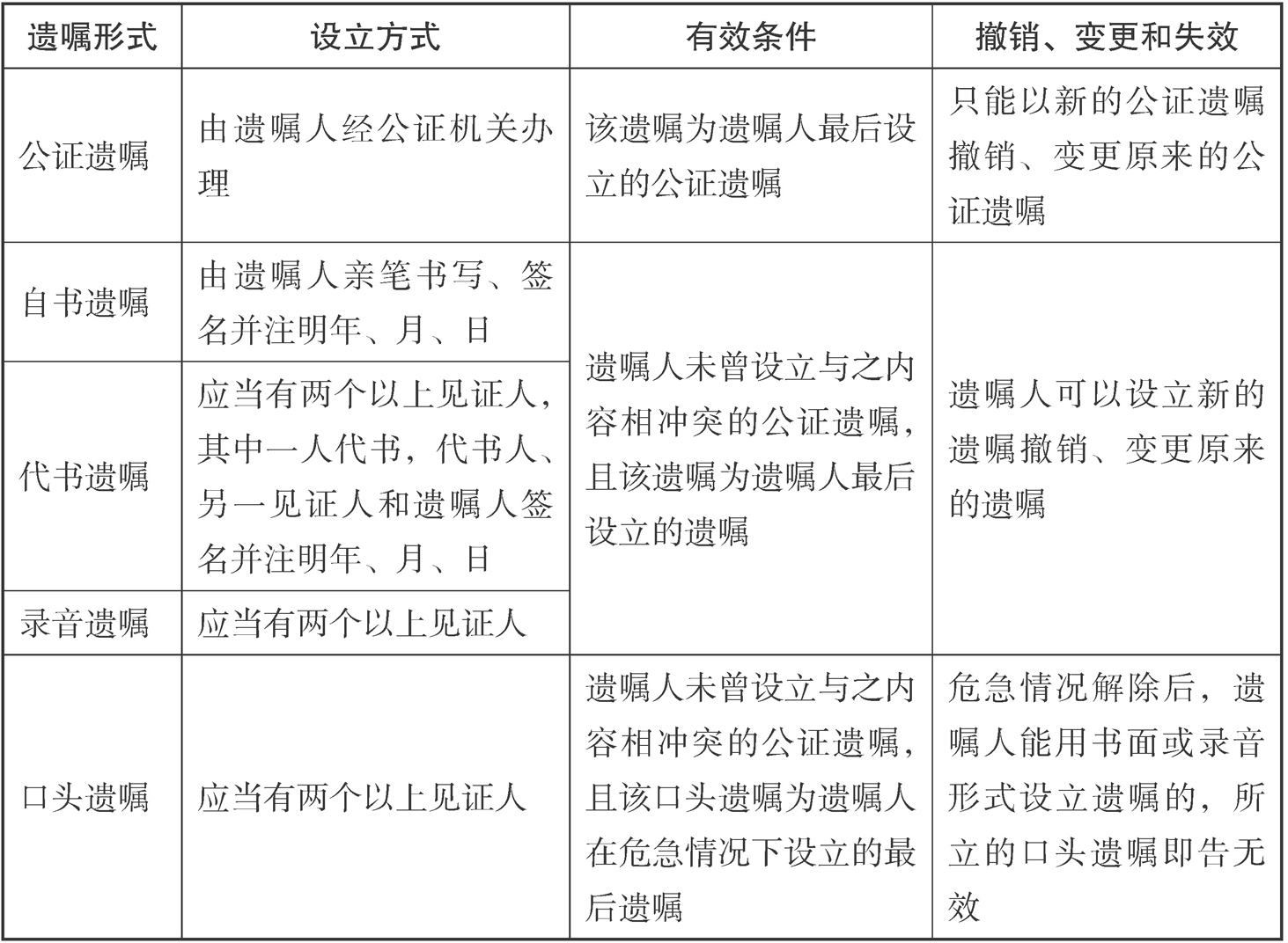 5.口头遗嘱。即立遗嘱人在危急情况下,无条件书写、录音或办理公证时,口头订立遗嘱的行为。口头遗嘱应当有两个以上见证人在场见证。危急情况解除后,遗嘱人能够用书面或者录音形式立遗嘱的,所立的口头遗嘱无效。