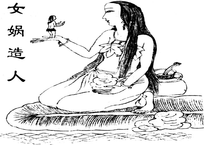 盘古死去若干年后,天神女娲诞生了。她独自一人来到凡界游玩,见大地之上虽有山川草木,天空之中亦有日月星辰,但却唯独缺少生灵,于是她便照着自己的模样,用黄土捏人。后来她嫌捏小人费时费力,便用树枝沾满黄泥乱甩,顿时,世间贵贱人等应运而生。狂喜至极的女娲继续挥动沾满黄泥的树枝,一群群小人就这样开始奔赴各处生存了。