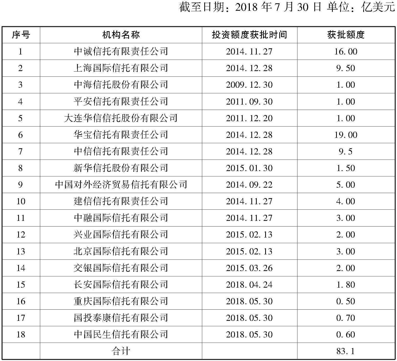 根据国家外汇管理局《合格境内机构投资者(QDII)投资额度审批情况表》:截至2018年7月30日,合格境内机构投资者投资审批总额度为1032.33亿美元,其中30家银行类公司合计获批额度148.40亿美元,58家证券类(证券公司、基金公司)公司合计获批额度461.3亿美元,46家保险类公司合计获批额度339.53亿美元,18家信托公司合计获批额度83.1亿美元。下表是信托公司QDII业务投资额度获批情况表。