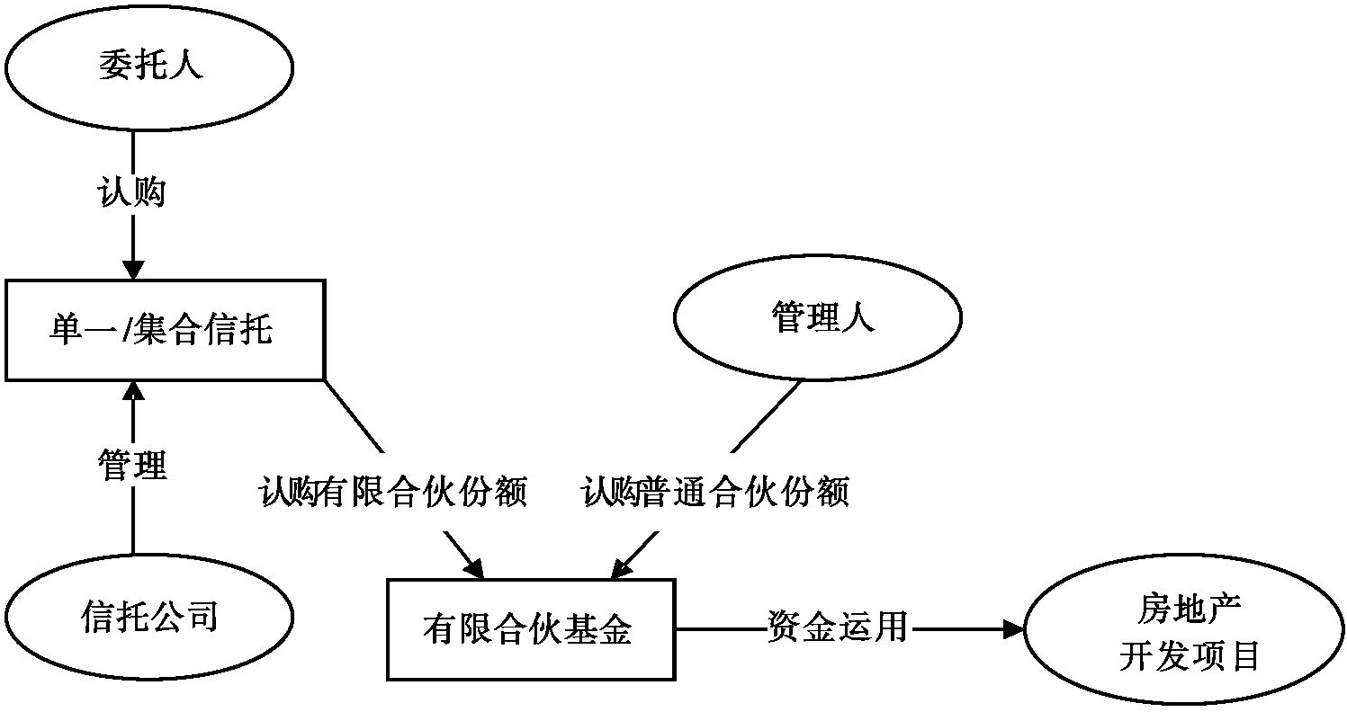 第三种类型是有限合伙基金,信托公司以信托项下信托资金认购有限合伙基金的有限合伙份额,由有限合伙基金管理人认购普通合伙份额,再由有限合伙基金综合运用多样化投融资方式参与房地产项目的开发经营。基本交易结构如下图:
