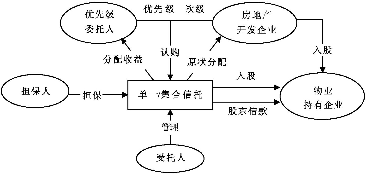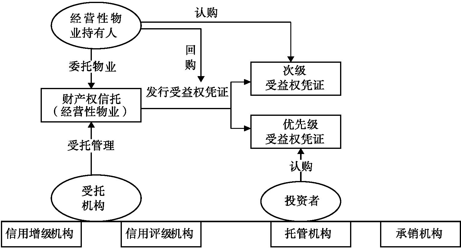 第一种类型的房地产信托基金是指开发商将其持有的能够产生稳定现金流的经营性物业委托给信托公司进行管理和处分,由信托公司以经营性物业产生的现金流为支撑,在公开市场向投资者发行信托受益权凭证,开发商或其指定的第三方可于信托期限届满时回购信托受益权凭证;信托公司也可以设计成结构化信托产品,优先级信托受益权凭证向投资者发行,次级信托受益权凭证由物业持有人持有。基本交易结构如下图: