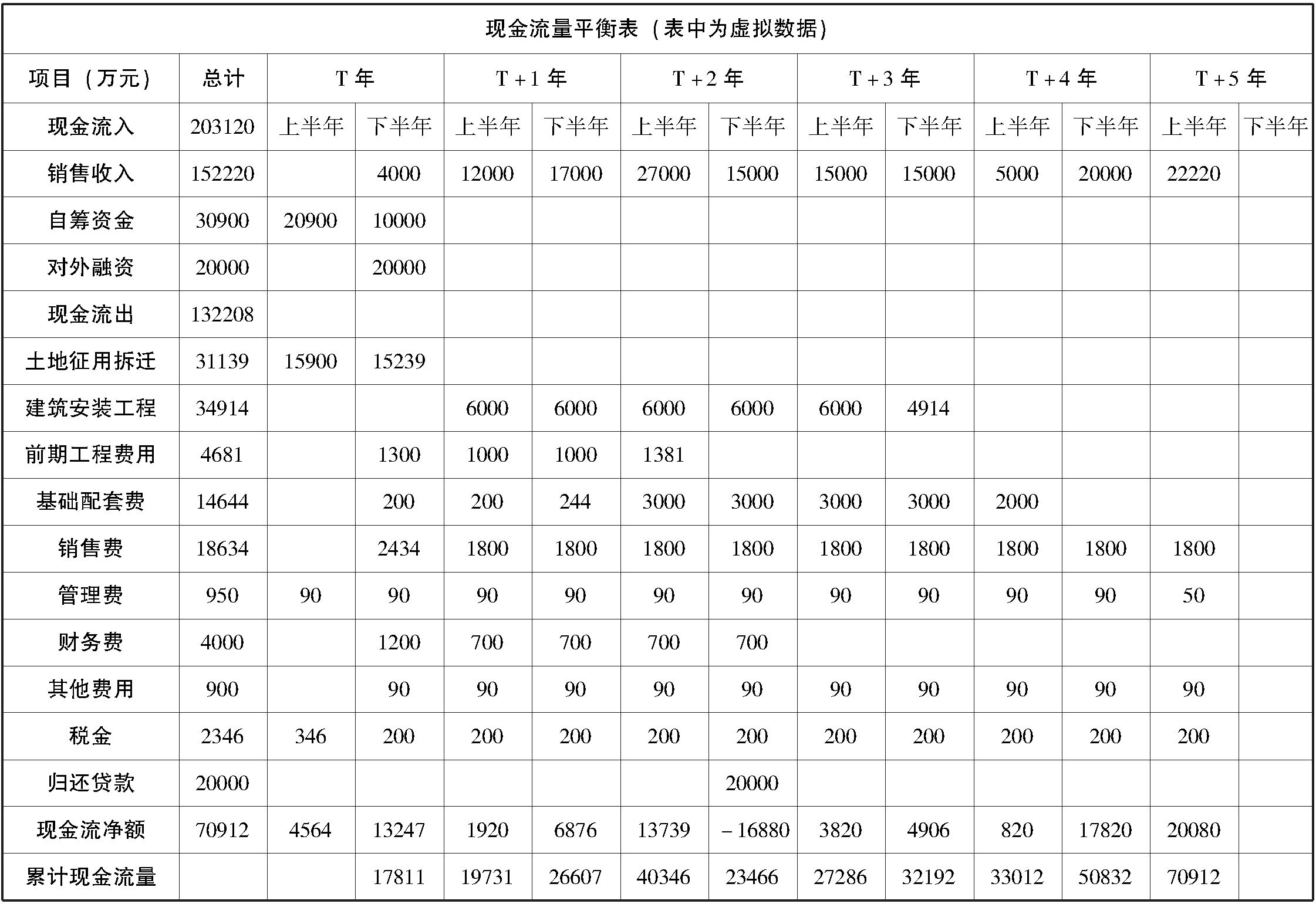 注:可以根据上述现金流量平衡表对信托期限内房地产开发项目的现金流入与流出情况进行分析,一方面可以了解房地产开发项目是否存在资金缺口从而产生项目完工风险,另一方面可以以此预测开发项目的现金流能否覆盖信托资金本金及投资收益。如果信托期限内累计现金流量净额为负值,则会对信托资金的退出产生较大的压力。