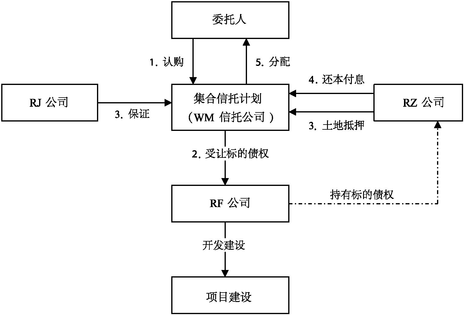 RJ公司的控股子公司RF公司在武汉市硚口区所开发的融侨锦江项目已经取得四证(国有土地使用权证、建设用地规划许可证、建筑工程规划许可证、建筑施工许可证),资本金投入比例近50%,RF公司具备房地产开发二级资质。RJ公司控股子公司RZ公司取得武汉市武昌区林头村K3地块,土地出让金及相关税费已付清,正在办理相关证照以进行后续项目开发建设。WM信托公司发起设立集合资金信托计划募集3亿元信托资金用于受让RF公司持有的RZ公司3亿元债权,RF公司将所获转让价款用于融侨锦江项目开发建设,并由RZ公司履行归还借款本息义务。