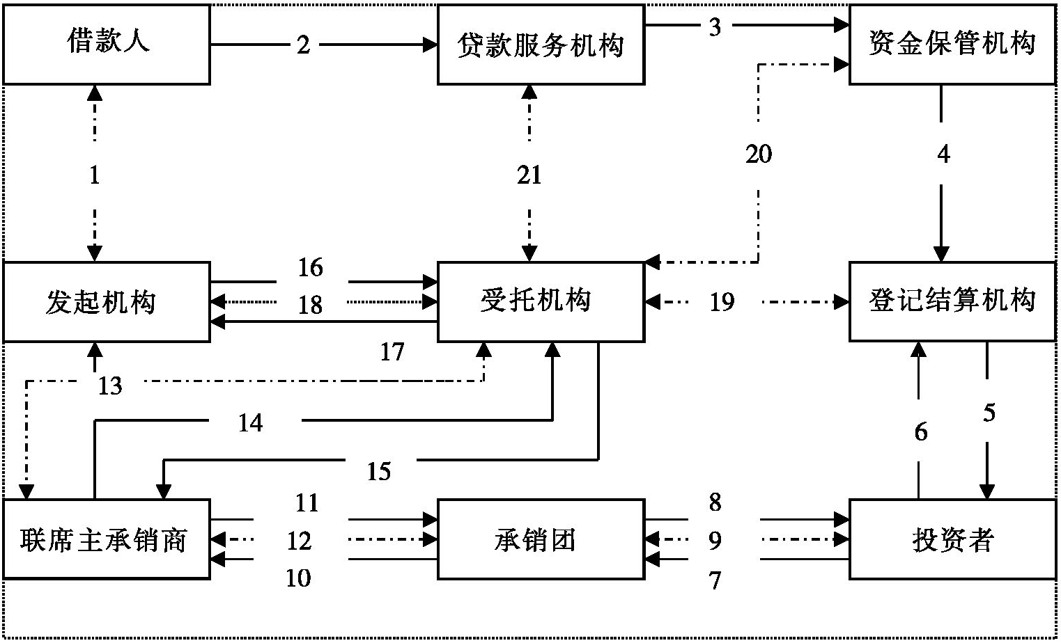 (3)受托机构通过承销机构向投资人发售资产支持证券,并由受托机构将证券销售收入向发起人分配。受托机构以资产支持证券的现金流向投资者分配投资收益。