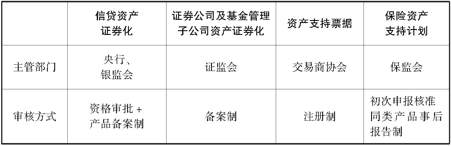 我国资产证券化主要分为四大模式:信贷资产证券化、证券公司及基金管理子公司资产证券化、资产支持票据、保险资产支持计划。信贷资产证券化业务由中国人民银行和银监会主管,主要交易市场为全国银行间债券市场;证券公司及基金管理公司子公司资产证券化业务由证监会主管,主要在交易所市场发行交易;资产支持票据由全国银行间市场交易商协会主管,主要在全国银行间债券市场发行交易;保险资产支持计划主要由保监会主管,在保险登记交易平台发行登记交易。