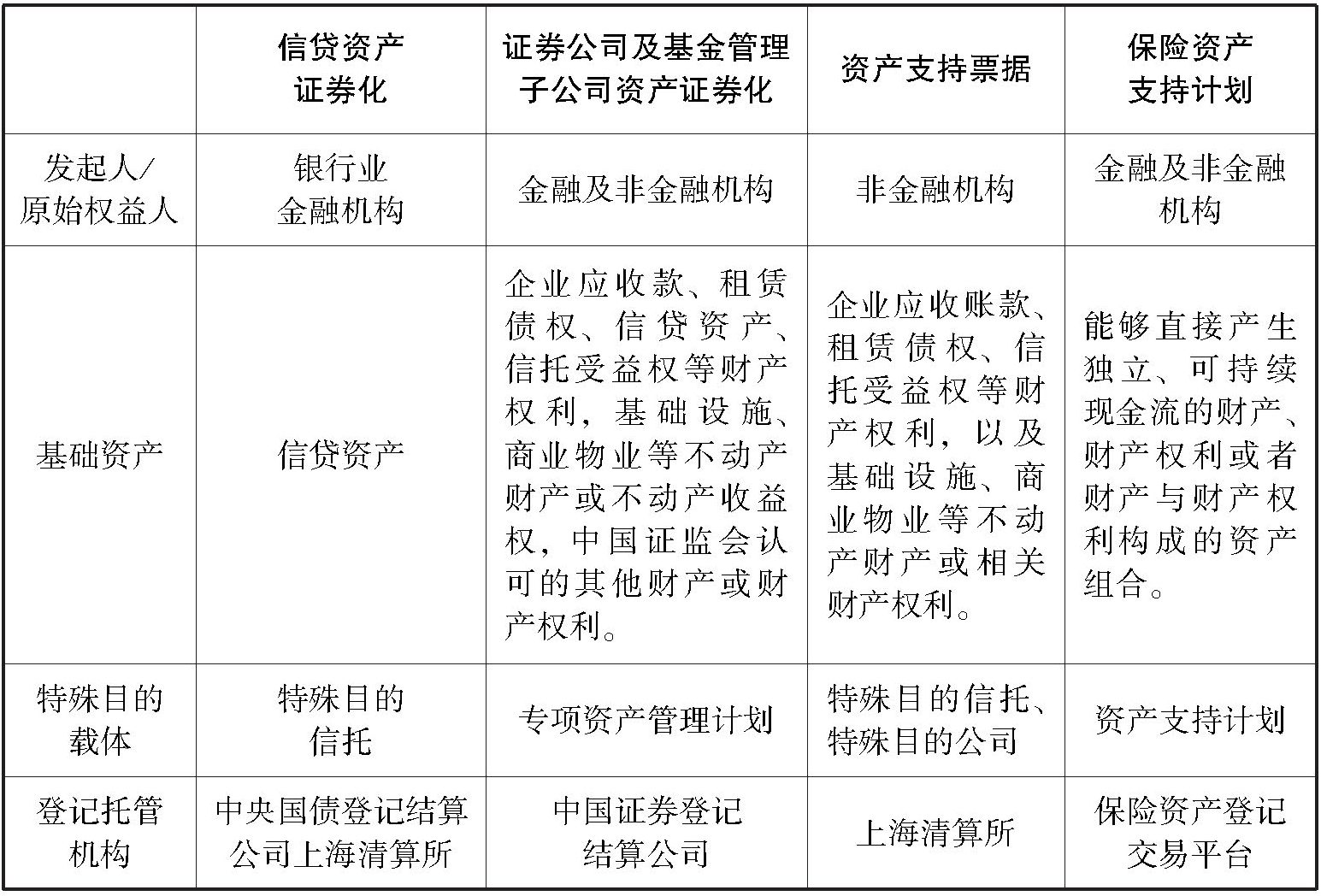 信贷资产证券化和保险资产支持计划采用特殊目的信托以实现基础资产的真实出售和破产隔离,从而使得资产支持证券持有仅需关注债项信用风险,而无须过多关切主体信用风险。根据银行间市场交易商协会于2012年8月颁发的《银行间债券市场非金融企业资产支持票据指引》,资产支持票据并未要求设立特殊目的载体,并非传统的资产支持证券,实质上仍为一般债券;但是,根据2017年8月29日修订的《银行间债券市场非金融企业资产支持票据指引》,明确了发行载体为特定目的信托、特定目的公司或交易商协会认可的其他特定目的载体,从而实现了资产证券化业务中基础资产的真实出售和破产隔离功能。