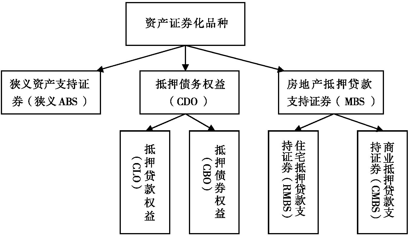美国资产证券化品种主要包括资产支持证券(ABS)和房地产抵押贷款支持证券(MBS):其中资产支持证券(ABS)又分为狭义的ABS(资产支持商业票据、汽车贷款、信用卡、学生贷款等)和抵押债务权益(CDO);房地产抵押贷款支持证券(MBS)又分为商业地产抵押贷款支持证券(CMBS)和住宅地产抵押贷款支持证券(RMBS)。