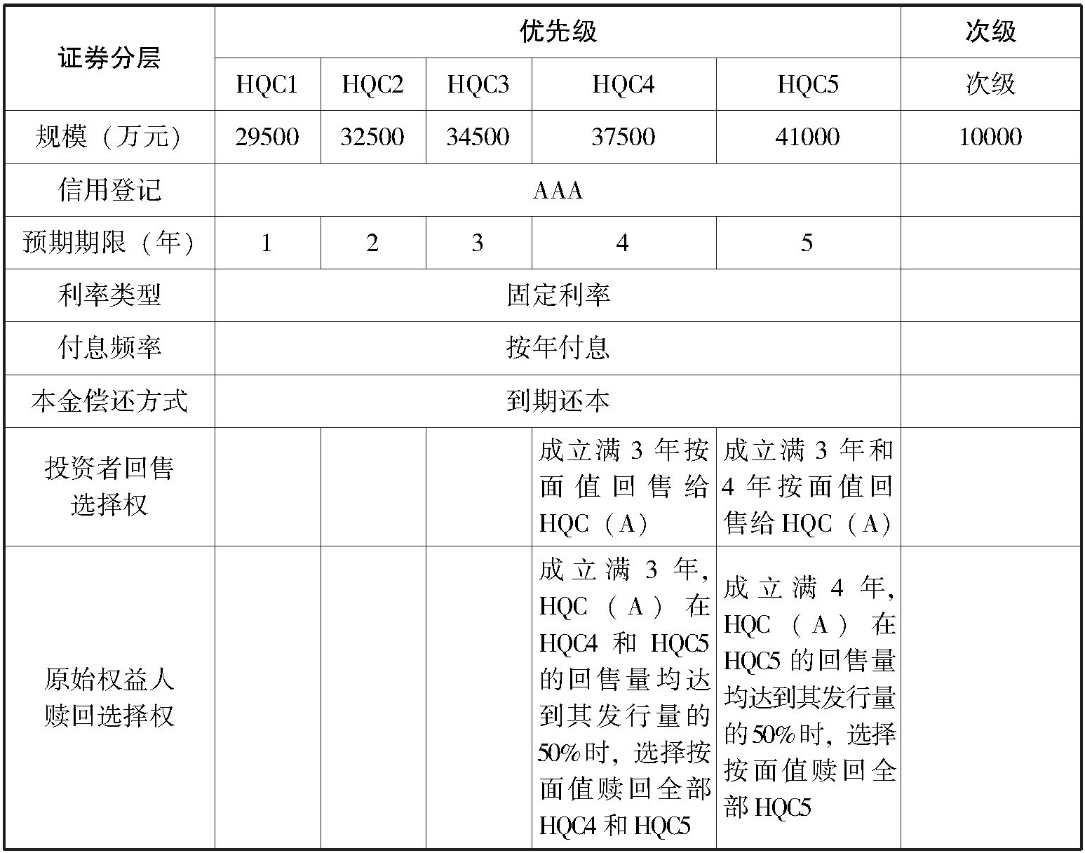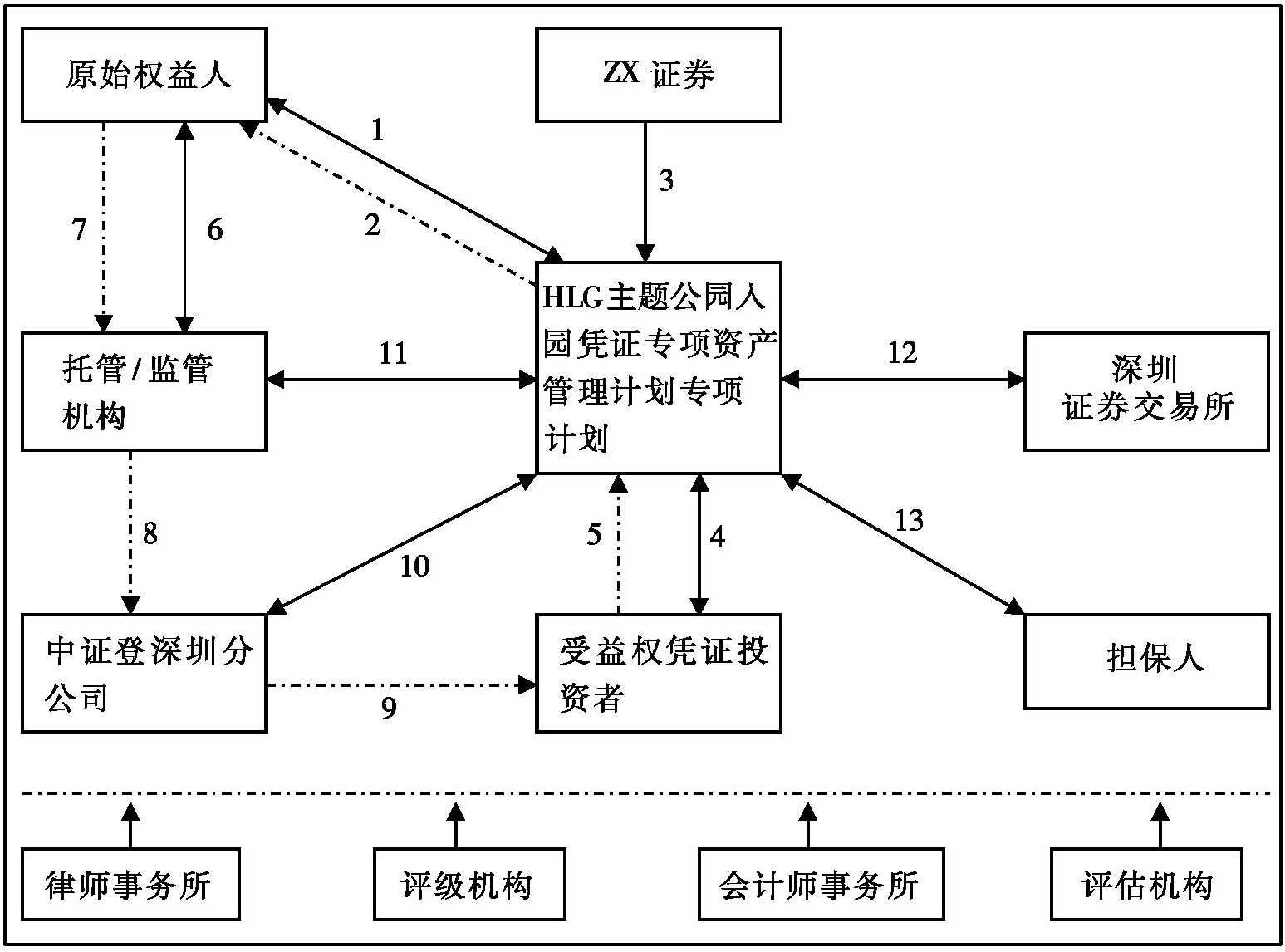 深圳HQC股份有限公司及其子公司北京SJHQC实业有限公司和上海HQC投资发展有限公司作为原始权益人,将其根据政府文件建设和经营HLG主题公园而获得的五年特定期间拥有的入园凭证出售给ZX证券,由ZX证券设立专项资产管理计划,向投资者发售受益权凭证。专项计划受益权凭证本金规模为18.5亿元,其中优先级受益权凭证为17.5亿元(分为HQC1-HQC5等五个品种,信用评级均为AAA级),次级受益权凭证为1亿元(全部由深圳HQC股份有限公司认购)。如果在每个初始核算日的前一个特定期间内,某个HLG主题公园的基础资产的销售均价或销售数量低于约定的销售均价或销售数量,则由原始权益人予以补足,HQC集团公司为原始权益人的补足义务提供连带责任保证担保。