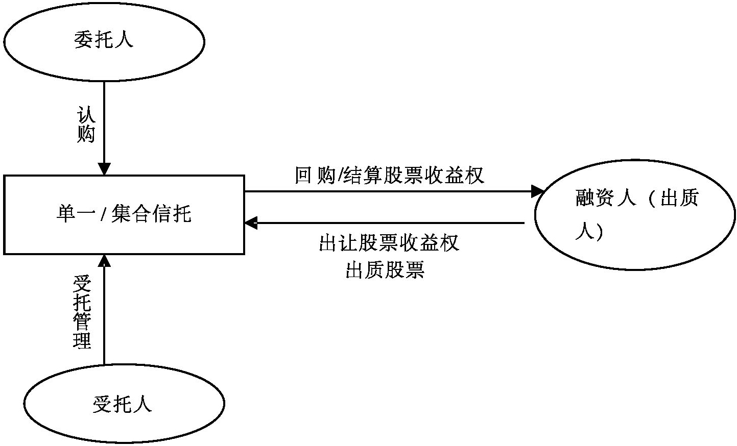 股票收益权业务是信托公司对股票质押融资业务的金融创新。由于信托公司集合类信托贷款规模不得超过其管理的集合类信托总规模的30%,所以信托公司创设了股票收益权业务类型以规避上述监管指标,基本的交易结构如下: