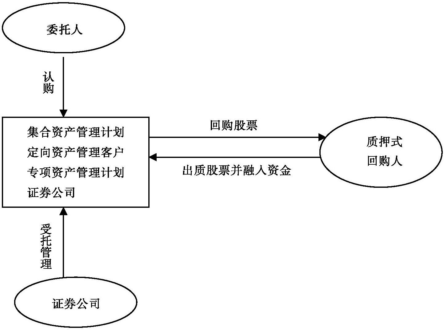 根据上海证券交易所和中国证券登记结算有限责任公司《股票质押式回购交易及登记结算业务办法(2018年修订)》定义,股票质押式回购交易是指符合条件的资金融入方以其所持有的股票或其他证券质押,向符合条件的资金融出方融入资金,并约定在未来返还资金、解除质押的交易。股票质押式回购交易仅限于证券公司、证券公司管理的集合资产管理计划或定向资产管理客户、证券公司资产管理子公司管理的集合资产管理计划或定向资产管理客户、专项资产管理计划;证券公司及其资产管理子公司管理的公开募集集合资产管理计划不得作为融出方参与股票质押回购。股票质押式回购交易的回购期限不得超过3年,延期购回后累计的回购期限一般不超过3年;以有限售条件股份作为标的证券的,解除限售日应当早于回购到期日。在回购期限内的标的证券产生的无须支付对价的股东权益一并自动予以质押(如送股、转增股份、现金红利等)[2],而所产生的需要支付对价的股东权益不自动予以质押(如增发、配股等),具体交易结构如下图[3]: