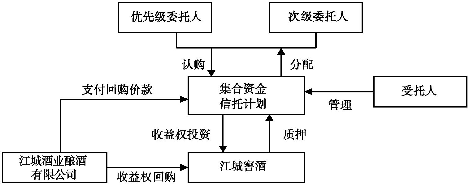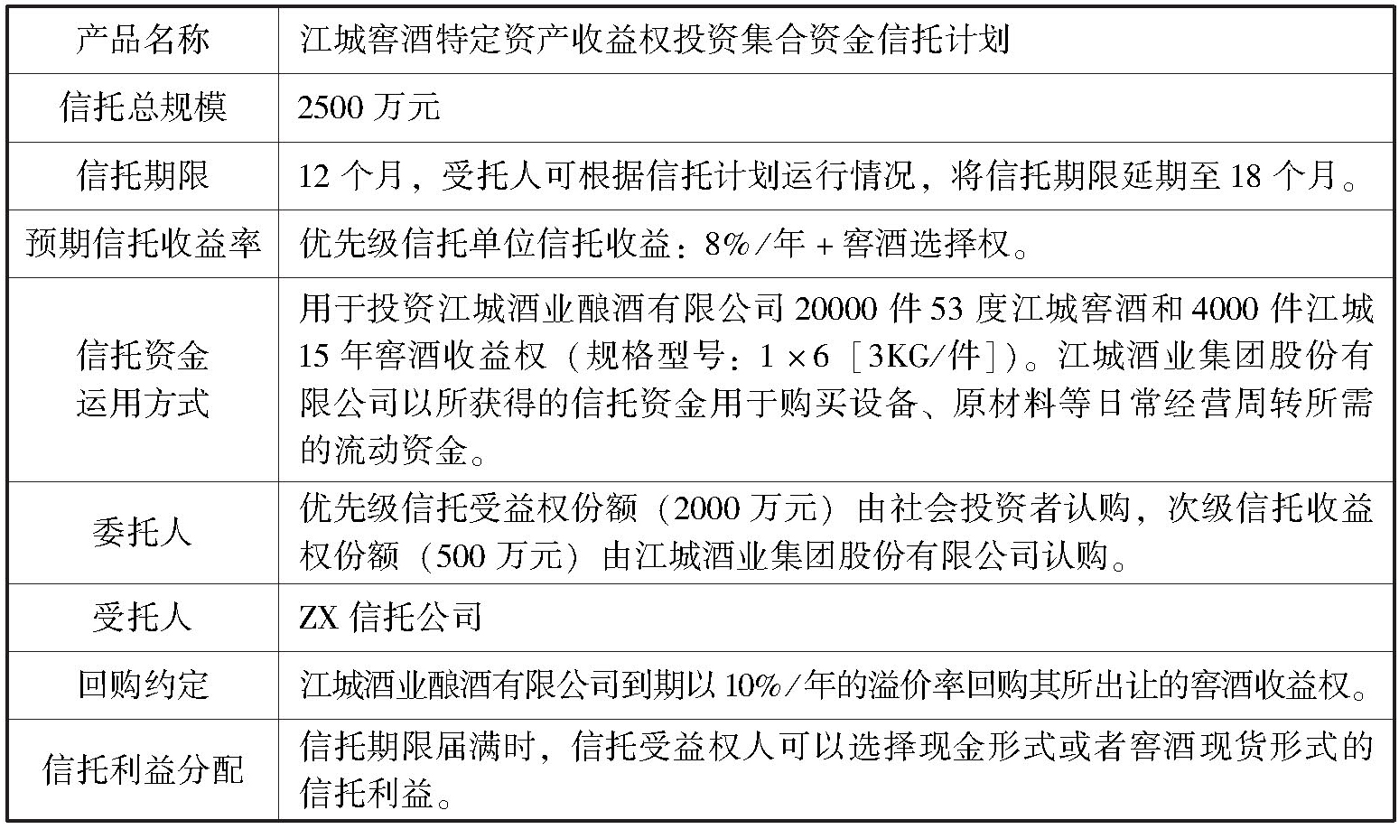 ZX信托公司发起设立江城窖酒特定资产收益权投资集合资金信托计划,其中2000万元优先级信托受益权份额向社会投资者发售,500万元次级受益权份额由江城酒业集团股份有限公司认购。2500万元信托资金用于投资江城酒业酿酒有限公司20000件53度江城窖酒和4000件江城15年窖酒收益权[规格型号:1×6(3KG/件)]。江城酒业酿酒有限公司以所获得的信托资金用于购买设备、原材料等日常经营周转所需的流动资金,江城酒业酿酒有限公司到期以约定的溢价率回购其所出让的窖酒收益权。为了保证其按时履行回购义务,江城酒业酿酒有限公司以20000件53度江城窖酒和4000件江城15年窖酒提供质押担保;如果信托期限届满时,优先级信托受益权人本金及预期信托收益不能获得足额兑付,次级委托人应当追加信托资金对优先级受益权人承担差额补足义务。