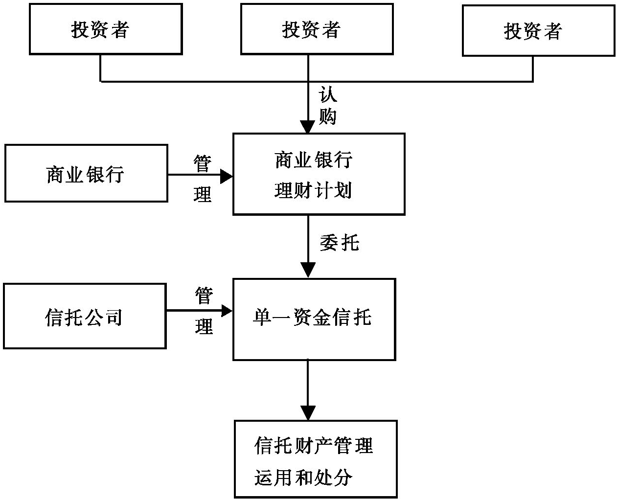 银信理财合作业务是指商业银行将理财资金交付信托,信托公司担任受托人并按照信托文件的约定管理运用和处分信托财产的业务。在通常情况下,银信理财合作业务由商业银行主导并承担实际风险,因此银信合作业务可以界定为事务管理类业务。银信理财合作业务基本交易结构图如下: