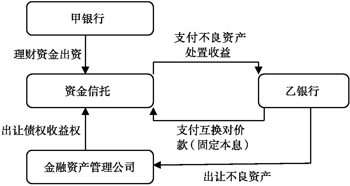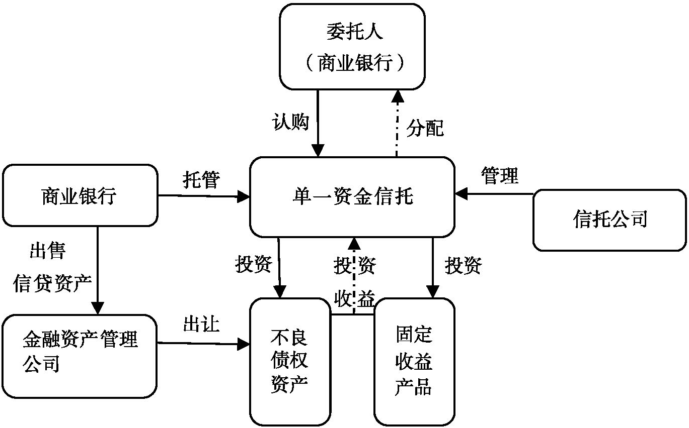 商业银行将其持有的标的不良资产按照协议价格转让给金融资产管理公司,商业银行委托信托公司设立单一资金信托,信托公司再以信托资金受让金融资产管理公司持有的不良资产。
