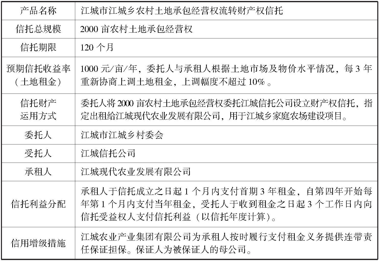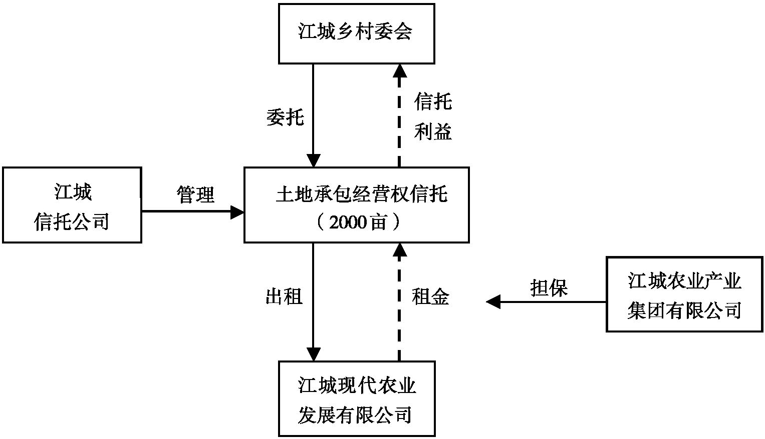 江城市江城乡村委会代表该村全体村民将该村2000亩农村土地承包经营权委托江城信托公司设立财产权信托,指定出租给江城现代农业发展有限公司,用于江城乡家庭农场建设项目。本财产权信托的期限为120个月,土地租金为1000元/亩/年(每3年可以协商上调租金,但上调幅度不超过10%)。承租人于信托成立之日起1个月内支付首期3年租金,自第四年开始每年第1个月内支付当年租金,受托人于收到租金之日起3个工作日内向信托受益权人分配信托利益(以信托年度计算)。江城农业产业集团有限公司为承租人按时履行支付租金义务提供连带责任保证担保。保证人为被保证人的母公司。交易结构图如下: