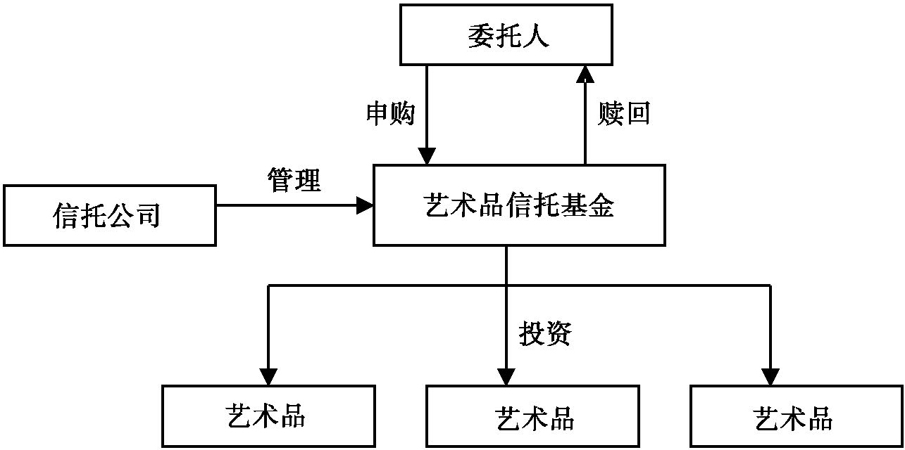 信托公司设立艺术品组合投资集合资金信托计划,募集信托资金用于进行艺术品的组合投资;投资范围可以限定特定种类的艺术品,同时设置相应的投资比例(比如艺术品信托投资范围为书画作品,其中古典书画的投资比例不超过15%~25%,近代书画的投资比例不超过25%~35%,当代书画的投资比例不低于50%)。艺术品信托的投资周期为5年~10年,或者更长的时间;信托公司可以设置一定期限的封闭期,投资者在封闭期结束后约定的开放期可以申购或赎回信托受益权份额。信托公司收取一定比例的固定信托报酬,并按照投资业绩的一定比例提取浮动业务报酬。