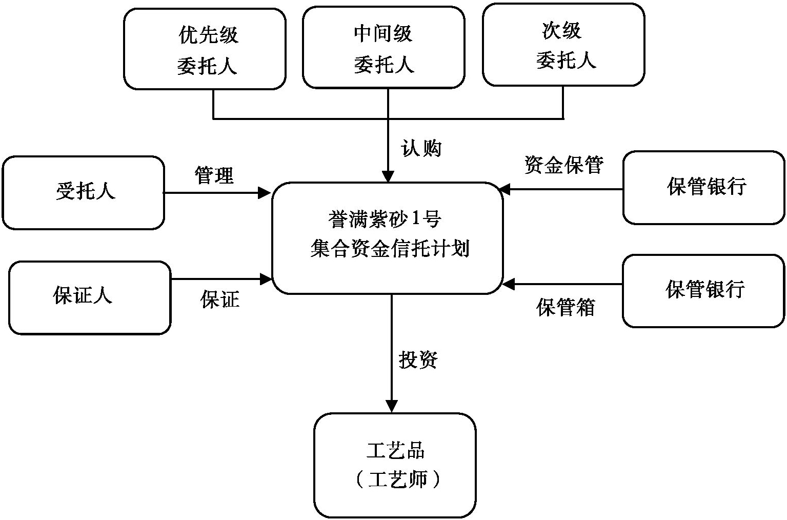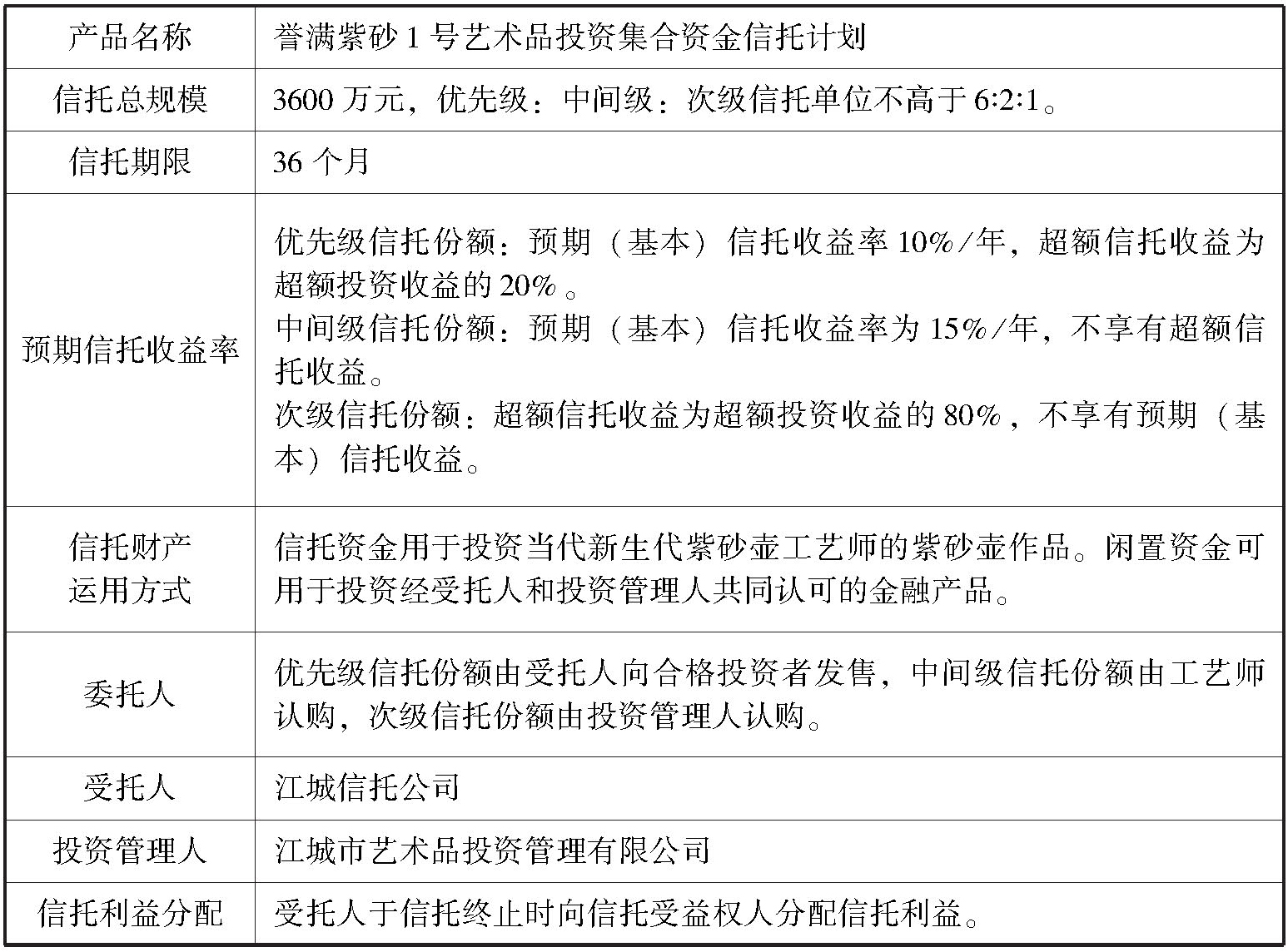 江城信托公司发起设立誉满紫砂1号艺术品投资集合资金信托计划,信托份额采取结构化分层设计,其中优先级信托份额由受托人向合格投资者发售,中间级信托份额由工艺师认购,次级信托份额由投资管理人认购。信托资金用于投资当代新生代紫砂壶工艺师的紫砂壶作品。闲置资金可用于投资经受托人和投资管理人共同认可的金融产品。