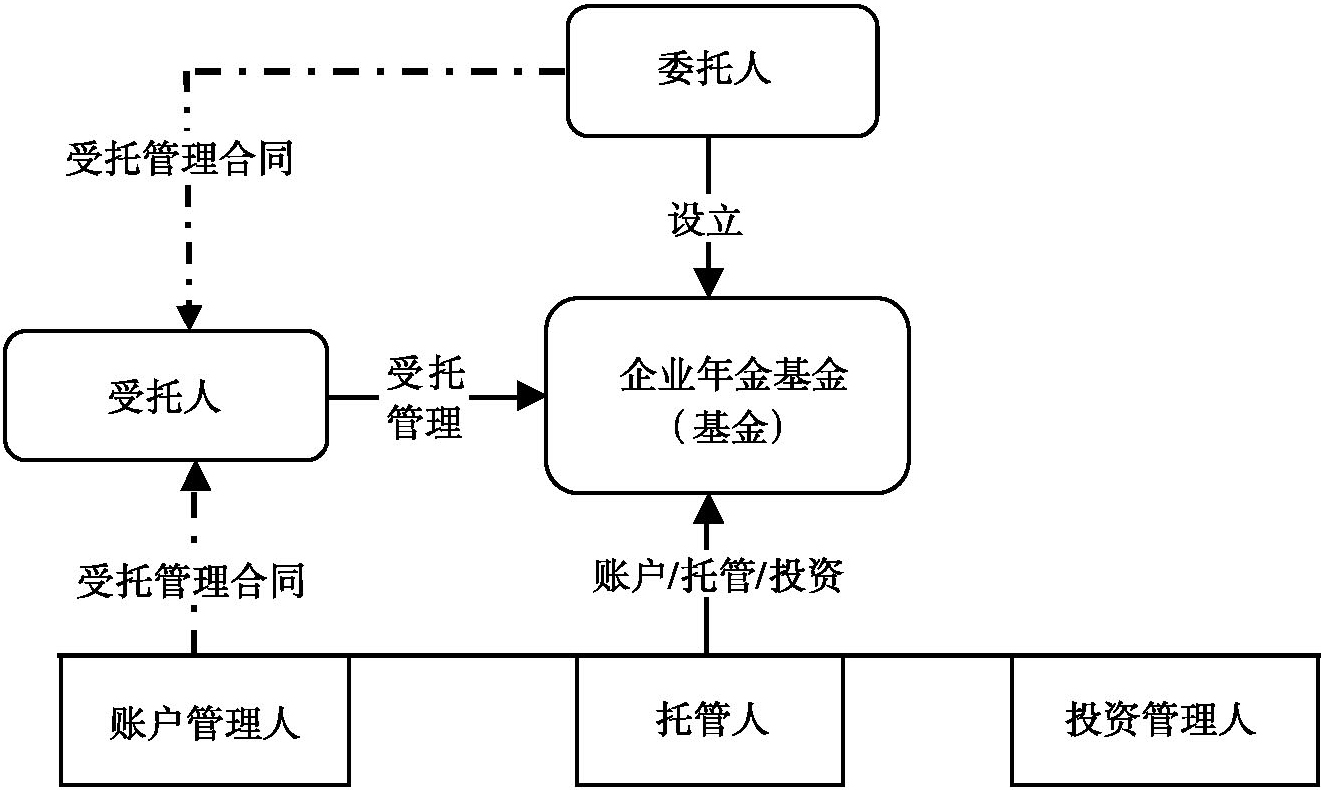 根据《企业年金基金管理办法》第一条规定:“为维护企业年金各方当事人的合法权益,规范企业年金基金管理,根据劳动法、信托法、合同法、证券投资基金法等法律和国务院有关规定,制定本办法。”由此可见,《企业年金基金管理办法》明确规定企业年金基金采用信托结构,委托人与法人受托机构或企业年金基金理事会之间形成信托关系。但是根据《企业年金试行办法》第十九条及《企业年金基金管理办法》第三条的规定,受托人与账户管理人、托管人、投资管理人之间为委托关系。