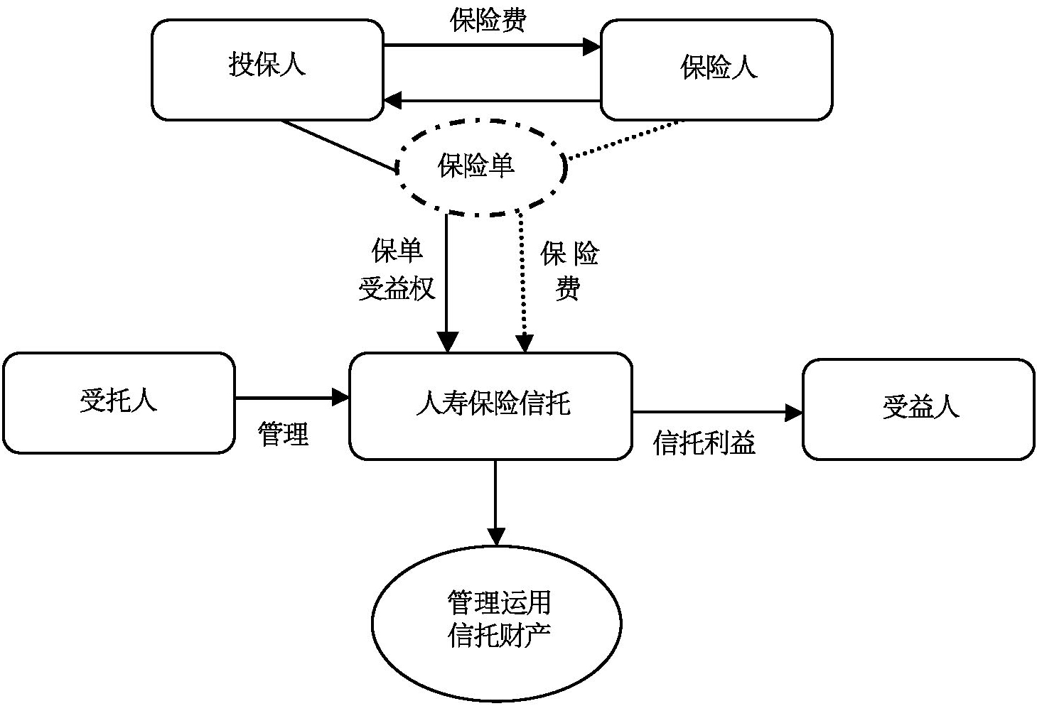 投保人与保险人签订人寿保险合同,并按照合同约定交付保险费;投保人作为委托人与信托公司签订人寿保险信托合同,以保险单受益权作为信托财产设立人寿保险信托。当保险事故发生时,保险人按照约定将保险金交付信托公司;信托公司按照信托合同约定,管理运用信托财产(保险金)。