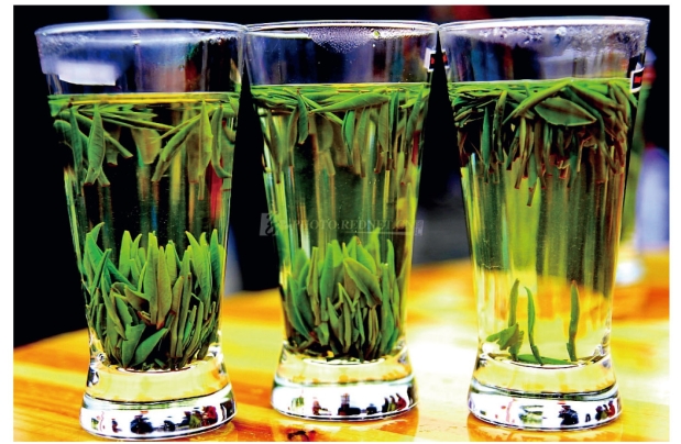 杯中的热水如春波荡漾,在热水的浸泡下,茶芽慢慢舒展开来,尖尖的叶芽如枪,展开的叶片如旗。一芽一叶的为“旗枪”,一芽两叶的称“雀舌”,标直的芽茶为“银针”,弯弯的芽茶为“齐眉”,卷曲的芽茶为“春螺”。品茶之前,先观赏在青碧澄清的茶水中,千姿百态的茶芽在玻璃杯中随波晃动,好像生命的绿精灵在跳跃、在舞蹈,十分生动有趣。
