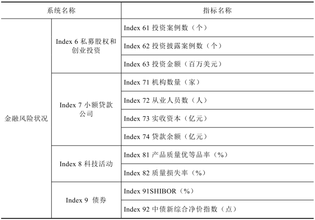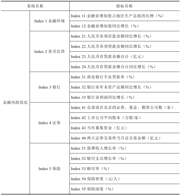 过去,北京市信贷领域问题时有发生,商业银行不良贷款率偏高,违约风险相对较大。北京市乃至全国的保险行业存在结构不合理的现象,财产保险业务与人身险业务规模失衡,发展力度不均。北京市证券行业的支付风险也逐渐显现。对私募股权和创业投资而言,针对性规范政策的缺失使其在发展经营过程中缺少法律支持,难以如其他成熟金融领域般规范化运营。北京市金融风险状况反映了北京市综合经济发展质量,因此北京市金融风险预警指标体系的选取要兼顾宏微观因素,既要把握北京市整体经济运行态势,又要分析北京市具体行业甚至企业的运行数据和相关经济指标。因此,借鉴已有相关研究成果,严格遵循金融风险预警与防范系统指标体系设计的全面性原则、科学性原则、实用性原则、目标性原则,结合北京市金融市场的实际运行情况,综合影响北京市金融风险的主要因素,引入金融环境、货币信贷、银行业、证券业、保险业、私募股权和创业投资、小额贷款公司、科技活动、债券业九大一级指标,其下二级指标共计29 个。