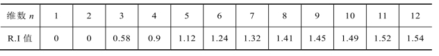 ,其中R·I 表示平均随机一致性指标,取值如表3.3 所示。当C.R<0.1时,表示判断矩阵A 具有较好的一致性。当C.R>0.1时,表示判断矩阵A 需要重新调整至通过一致性检验,即调整至C.R<0.1。