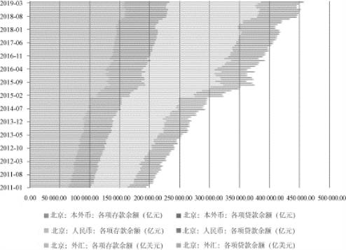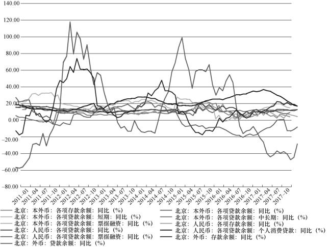 由图4.3 可知,自2011年至2019年3月,北京市本外币各项存款余额由64 610.2 亿元增至159 000 亿元,增加近1.5 倍,本外币各项贷款余额由36 794.2亿元增长至74 000 亿元,增加约1 倍。其中,北京市人民币各项存款余额由62 378.2 亿元增长至153 000 亿元,各项贷款余额由29 874.3 亿元增加至70 000亿元。北京市外汇各项存款余额由 338.7 亿美元增加至 954.5 亿美元,各项贷款余额由1 050.2 亿美元增加至1 565 亿美元。图4.4 给出了北京市本外币、人民币及外币存贷款余额及其下属典型类别同比增长情况。值得关注的是北京市人民币各项贷款余额中用于票据融资的资金同比增长率、北京外币存款余额的同比增长率在2011年至2017年出现较大波动,但二者趋势大体一致,于2012年出现波峰(分别为 111.9%和70.1%),2013年初开始大幅下降。其中,北京市人民币各项贷款余额中用于票据融资的资金同比增长率自2013年7月至2014年7月为负数,即余额下降,2014年6月出现下降速度最高点15%。北京外币存款余额的同比增长率在2015年4月至2015年底为负数,下降速度最高点出现在2015年8月,达到16.8%。