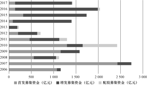 证券市场募集资金有三个来源:首发募集资金、增发募集资金和配股募集资金。由图4.8 可知,2011年之前,证券市场募集资金主要来源于首发募集资金,2011年之后主要来源于增发募集资金。2006年,北京市证券市场首发募集资金为1 073.4 亿元,增发募集资金为79.4 亿元,配股募集资金为0,当年募集资金合计1 152.8 亿元。2011年,北京市证券市场首发募集资金为462 亿元,增发募集资金为 661.7 亿元,配股募集资金为 175.6 亿元,当年募集资金合计1 299.3 亿元。2017年,北京市证券市场首发募集资金为127 亿元,增发募集资金为1 281.4 亿元,配股募集资金为7.7 亿元,当年募集资金合计1 416.1 亿元。2018年,北京市证券市场首发募集资金为 739.39 亿元,增发募集资金为1 952.52亿元,配股募集资金为10.73 亿元,当年募集资金合计2 702.6 亿元。