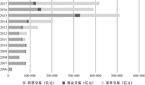 北京市证券市场交易额由股票交易额、基金交易额和债券交易额组成。根据图4.7 可知,2011年之前,股票交易占证券市场交易额过半比例。2011年之后,基金交易额和债券交易额在证券市场交易总额中所占比例持续扩张,股票交易额绝对值增加,相对值减小。2006年,北京市证券市场股票交易额为14 851.5亿元,基金交易额为 298.3 亿元,债券交易额为2 075.2 亿元,证券市场交易额合计19 557.1 亿元。2011年,北京市证券市场股票交易额为61 743.2 亿元,基金交易额为1 494.8 亿元,债券交易额为15 275.3 亿元,证券市场交易额合计79 103.1 亿元。2017年,北京市证券市场股票交易额为115 095.3 亿元,基金交易额为10 599.7 亿元,债券交易额为293 247.9 亿元,证券市场交易额合计446 308.3 亿元。值得注意的是,在股票交易额总体呈下降趋势的情况下,2015年的股票交易额出现激增,达到305 252.9 亿元。