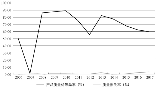 本研究主要考虑科技活动的两个经济指标:产品质量优等品率和质量损失率。根据图4.12 可知,2007年北京市产品质量优等品率出现大幅下降,由2006年的50.4%降至1.1%,产品生产质量急剧下降。2008年以后,产品质量优等品率开始回升,除2012年较低(56.7%)外,其余年份均保持在60%以上。2010年产品质量优等品率最高,为89%。北京市质量损失率一直保持较低比率,一般低于1%,仅2013年(2.3%)、2016年(2.1%)、2017年(3.3%)、2018年(2.7%),质量损失率超过1%。值得注意的是,由图4.12 可知,2015年之后北京市质量损失率存在上升的趋势。