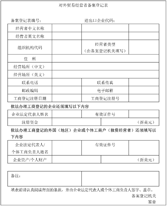 Figure 1-1 The Form for Registration as a Foreign Trade Dealer