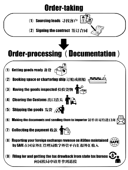 The above basic process can be classified roughly into two stages:order-taking and order-processing(see Figure 1-3).Order-taking involves a lot of strenuous work aiming at developing the market to generate trade leads and sign the contract.Order-processing,involves fulfilling the order in accordance with the contract and trade practices.Order-taking and order-processing,therefore,make up the main body of your routines.Obviously,taking an order hinges more on your marketing skills,capability and experience,while processing an order,on the other hand,is more of a routine job which requires patience and meticulousness.