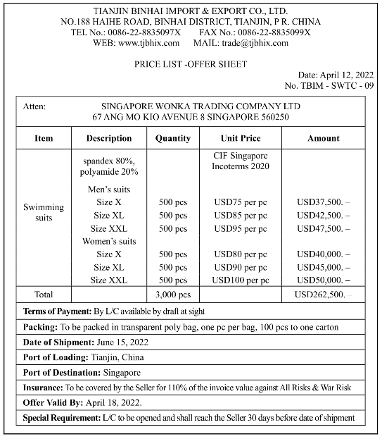 In the above store-shopping example,the shop owner may respond to your enquiry by showing you the jacket and telling you its price—“It’s 200 yuan.”This makes a quotation in a domestic negotiation.A quotation is part of an offer.You may bargain,for sure,but if you like the jacket andaccept the price,a deal is concluded and the shop owner must sell you the jacket under this price.Similarly,in an international negotiation,an offer is a business proposal made by the exporter or importer to express his/her wish to sell or buy particular goods under stated terms.An exporter can make a “selling offer”,and an importer a “buying offer”,or a “bid”.Figure 3-2 below is a possible selling offer you can make for the above case of selling swimming suits.If the same terms in the case were proposed by the importer for procurement,that would make it a buying offer.