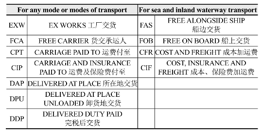 The first group includes the seven Incoterms rules that can be used irrespective of the mode of transport selected,and of whether one or more than one mode of transport is employed.EXW,FCA,CPT,CIP,DAP,DPU and DDP fall under this class.
