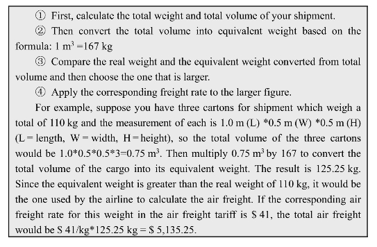 Similarly with ocean shipping,when calculating air freight,both the total weight and total volume are taken into consideration.You need to apply a formula to convert the total volume of a shipment into an equivalent weight and compare it with the real weight of the cargo or vice versa.Whichever figure is larger would be selected by the airline as the one for calculating air freight.The formula for converting from volume to equivalent weight is 1 m3= 167 kg(for converting from weight to equivalent volume,the formula is 1 kg = 6,000 cm3).