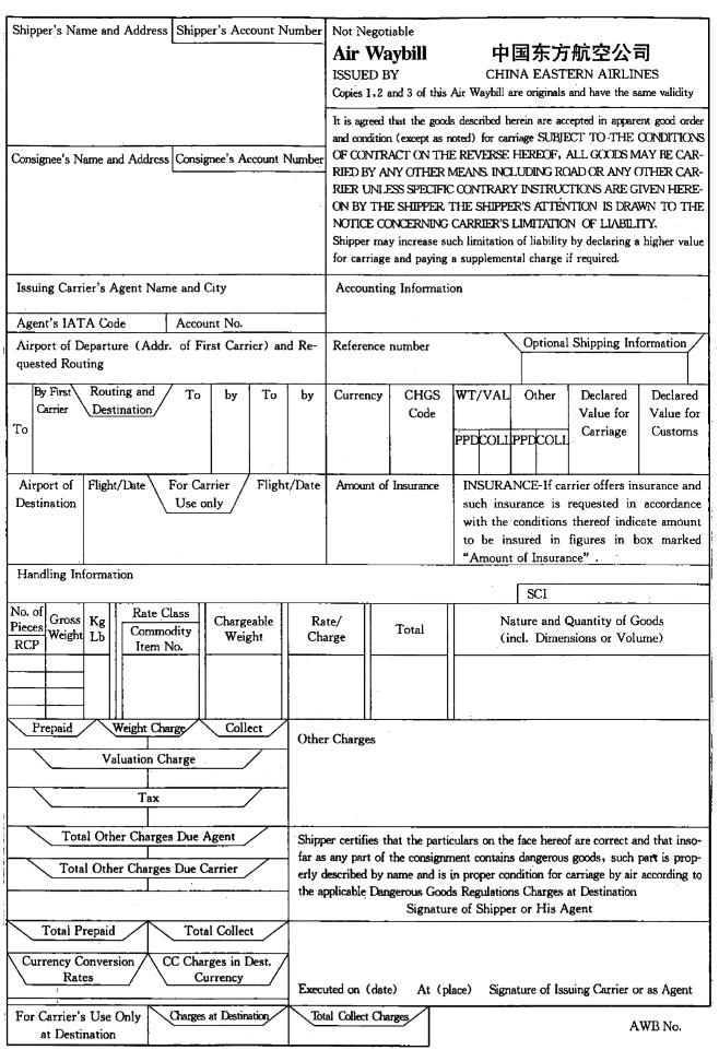 Waybills and some straight B/Ls are not documents of title.These documents merely show the names of the shipper and consignee.Since a straight B/L and a waybill only envisage delivery be made to the named consignee,the importer doesn’t need to present the documentfor taking delivery.However,if a straight B/L expressly states that“delivery shall only be made against presentation of an original B/L”,this requirement turns the straight B/L into a title document and should be complied with.Most waybills,however,expressly state that presentation is not required for taking delivery(see Figure 7-3 and Figure 7-4).