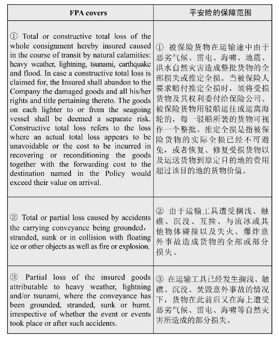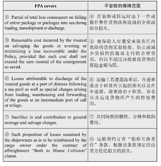 FPA is a type of limited coverage which covers total losses and general averages arising from marine perils including natural calamities and fortuitous accidents.It literally means that particular averages are not covered,but with the real-world development of marine cargo insurance,some particular averages(of a partial loss nature)are now recoverable,including those caused by fortuitous accidents alone or by fortuitous accidents and natural calamities combined,etc.The specific eight types of coverage are listed as follows(see Table 8-1):
