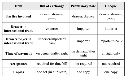 All of the three are negotiable instruments that can be used for settling international transactions,although promissory notes and cheques are used only in limited regions or countries.Both a bill of exchange and a cheque are orders of payment while a promissory note is a promise of payment.A cheque is a special form of bill of exchange in that its drawee/payer is a bank.