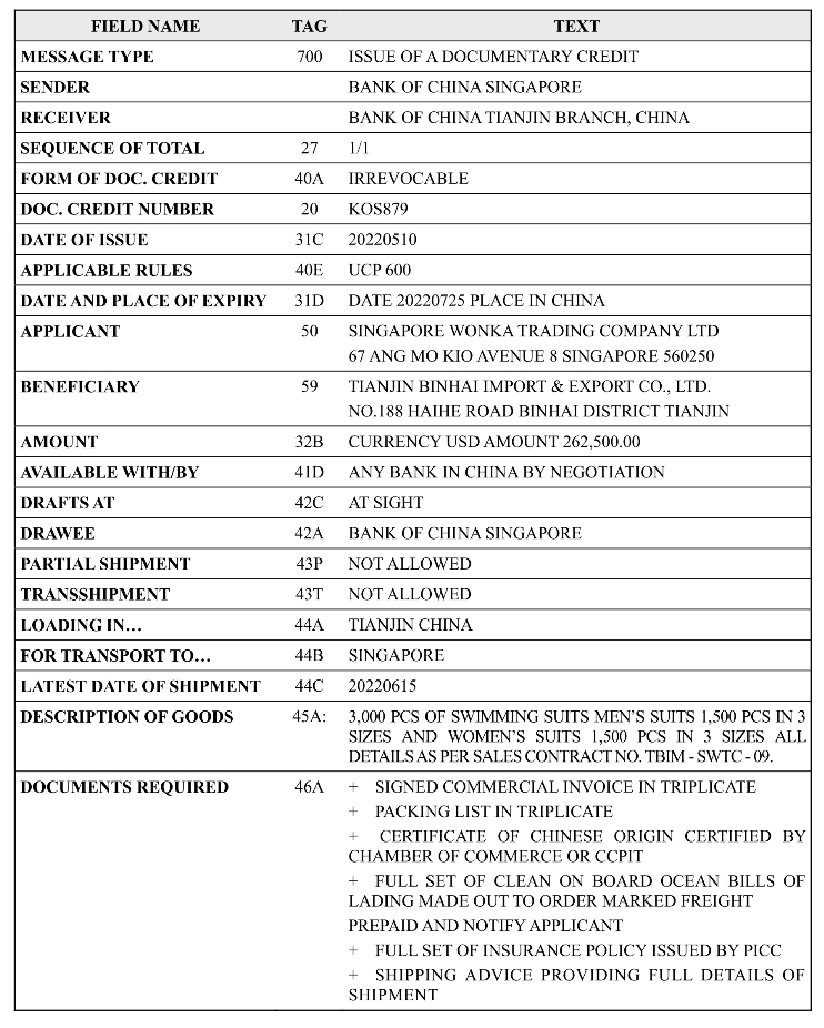 Table 11-1 A Letter of Credit Transmitted Through SWIFT Codes